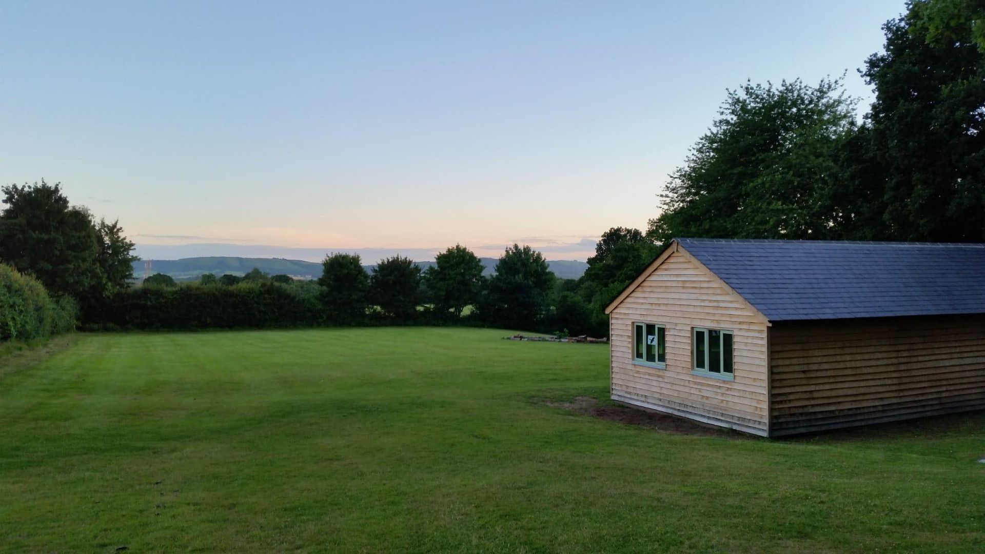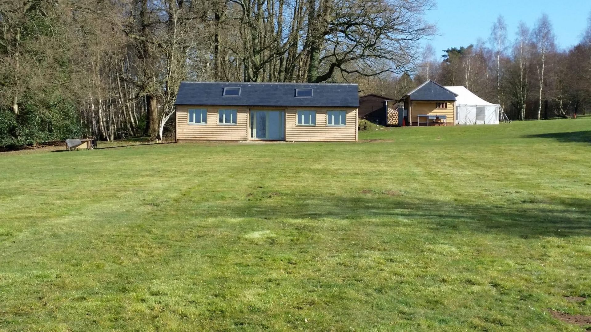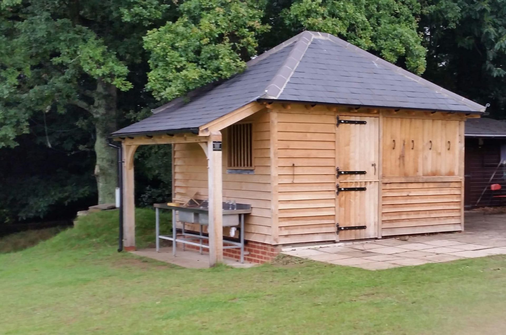 Dining Shelter: Adjacent to the kitchen is a 20ft x 30ft oak framed, slate roofed dining shelter equipped with tables and chairs.